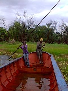 The fishermen take a break to take the tourists out in the steel hippo boat. | 23 Hippos at Mare aux Hippopotames | Our little hideaway bush camp on the way to Mali |