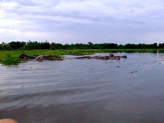The next day Punda had a bit of surgery - some welding. Oh dear, the cracks are starting. It is a shame that aluminium roof racks weren't available when our steel one was made. After about 40 kms down a bad piste and then 20 km down an even worse piste we reached the Mare aux Hippopotames (hippo pond). It is actually a very large lake with no edges. You have to be careful not to drive off the swampy piste straight into it. We stopped the car when the water level reached about 5cm then walked to knee depth before getting into a pirogue with a couple of fishermen for a cracking experience - one of the best yet. After half an hour of being punted along the lake using bamboo poles we spied huge grey rock-like formations at the lakeside. At a distance of about ten metres the rocks "woke up". Wow, what a sight. 23 hippos dashed for deeper water. It was incredible. We stayed for about half an hour - us watching them and them watching us. We were at spitting distance away from one of Africas most dangerous animals and it was so exciting. In fact, with all the excitement I fell over in the boat. This was an experience not to be missed, particularly at a price of two pounds each! We were also delighted at Pundas recent performance - over 30mpg on two separate occasions.