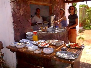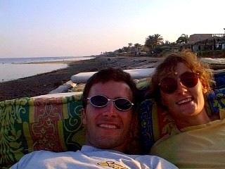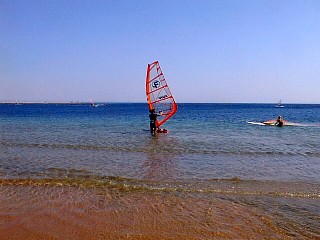 Saturday followed and Dahab wouldn't let us go. We didn't have to be out of Egypt until midnight on Sunday so we decided to stay for another day. We headed off to the Lagoona where you find all the expensive hotels and the windsurfers for hire. Andrew hired a board and went out to tackle the wind. I just read in the sun because the wind was far too strong for me. That night was our last in Dahab and we treated ourselves to a fish dinner on the seafront.