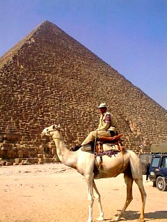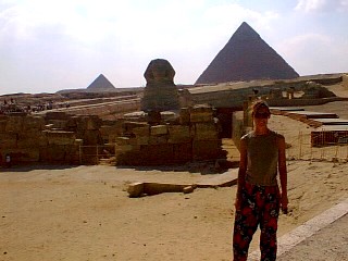 The next afternoon we visited the pyramids at Giza. There are many pyramids around Egypt but the ones at Giza are the most famous for their design and size. It is so strange getting to the pyramid site because you drive along a very busy six lane highway which suddenly ends because you reach a pyramid. It gives a new meaning to the comment 'it's just at the end of the road'. Anyway we bought our tickets using our student cards and had a drive around. A look inside the small one wasn't particularly exciting - just a room at the end of tunnel and a man extracting money out of unwary tourists. Us being 'travellers' gave him nothing! The Sphinx and its surroundings were good to see but it was hard to imagine that when these were built the Nile River was very close. Now it is miles away.