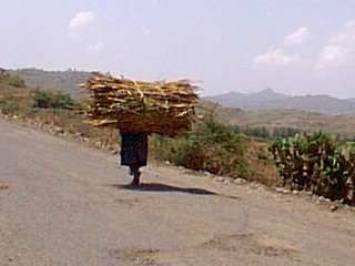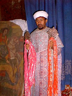 | Getachew and Dereje - excellent Mercato guides. Find them outside the Tana supermarket | ('Ye Keet Kussel' - Amharic for 'Pain in the Arse') - Avoid this bloke like the plague. | This old lady was carrying this load up a very steep hill | Mariam Church on the Kobbo - Lalibela road | Mariam priest in the doorway |