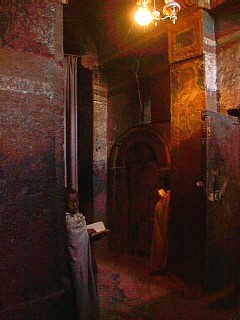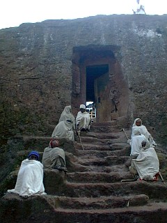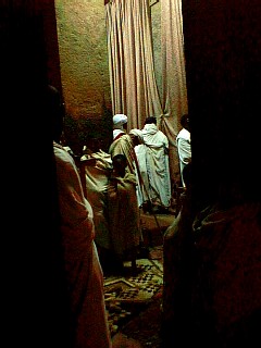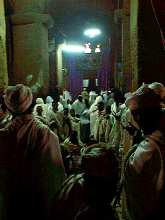 | Monks, nuns and beggars. | Inside one of the churches - people praying | Monks chanting and shaking their brass 'kerching sound' makers | The secret passage between churches. Watch out for the bats | The end of the passage. Now blocked up following the theft of King Lalibelas processional cross from that church. |