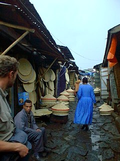 Back at the mercato we all had a fantastic time. It has such atmosphere. This time we had two guides -Dereje and Getachew, who were arranged from outside the Tano Supermarket.We would definitely recommend these chaps. Our friend (not) from our last visit also arrived on the scene and followed us around like last time. We tried to ignore him but he wouldn't go away. Even the locals call him 'ye keet kussel' (pain in the arse)! Coffee apparently originated in Ethiopia so I bought some of the best Harar beans for my mum and dad. They aren't roasted yet though so that should be a laugh back home! We passed basket stalls, men bending old bits of metal into something new. There were coffee grinding containers (just hollowed out bits of wood) where you bash the beans with a metal bar such as a car steering rod. Dennis managed to find an old mortar shell to do the job. There were incense stalls where the smell was more overpowering than the coffee. The spice stalls were incredible and the crafts type shops just like Aladdins cave.