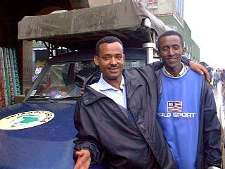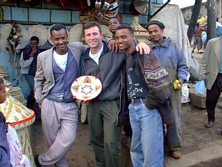 | Justin and Andrea going north | Tim, Clare and Cairo heading off to Uganda to build and School (check 'links' for their web site) | Our long suffering chum Derek. (This man has been waiting for 50 years to get to Cairo !) | Getachew & Bereta helping us get some goodies at the Mercato | Whatever Dennis is doing with his hand seems to work for Aaron in Deli Roma |