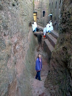 Lalibela is famous for its collection of churches dating back 900 years. They are cut out of the rock and their roofs are level with the ground. The churches are located in the middle of town surrounded by stick and mud houses or by homes cut out of the rock where the nuns live.