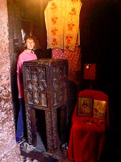 | This is a very old old testament - 900 years. The pages are made from goat skin | Jacs by a very old box. It is older than the 900 year old church | Priests bring out the crosses and explain the symbolism. Note the picture of St. George & the dragon behind | The winding maze of levels, passageways, tunnels and stairs are astounding | I think it's this way ? |