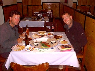| Our guide Lucas at Jinka | Local dish at Bel Air Hotel | Bath mat 'injera' | Paul and Yvonne going South (check 'links' for their web site) | Dennis (doing the monkey impression) & Aaron (check 'links' for 'edventure' satellite liked web site) |
