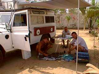 The next day another Landy arrived at the site. It was Noel and Sally who we had heard about in Morocco. We had expected them to be ahead of us but they managed to banana their chassis and front axle when they fell of the back of a sand dune in the desert. They had spent two weeks in St Louis getting their Landy, called Turtle, straightened. Suddenly there were six Brits at the campsite and it was time to party!