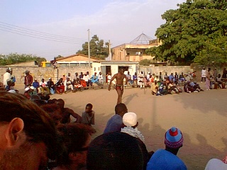 That evening we attended the highly recommended wrestling match. It is a two hour event where three teams of wrestlers with accompanying drummers prance around the audience for one hour and fifty seven minutes in the attempt of getting a few dalasi (5p). The wrestling itself lasts three minutes if you are lucky and just at the crucial moment the drummers block your view as they continue to circulate around the audience. What a load of rubbish. It is just another tourist tax. The arena had its fair share of wheelchair bound locals asking for money too. One chap had no hands and no feet. He shuffled around with flipflops strapped to his knees and carried a file in his arm stumps, which he passed to the toubabs to read. Inside the file there was a bit of paper with writing in various languages requesting money. It is a terrible thing but it took all my energy not to laugh - the poor geezer was saving up for an eye operation! As if he didn't have enough wrong with him. Anyway we left the wrestling arena and missed the fun. According to Chris some chap had been caught thieving and two dozen locals took turns to beat him up. Anything that has the potential to reduce tourism here is serious.
