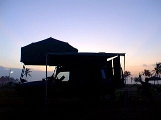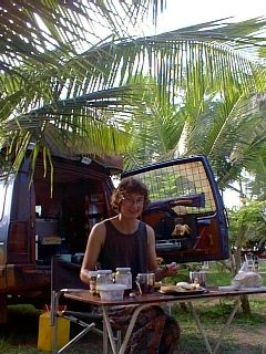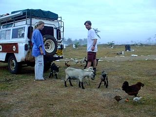 The next day our man from the shipping office was away so we spent the day in a cybercafe and visiting other supermarkets. I thought I'd gone to heaven when I walked into one shop and they were stocking Tesco goods. Can you believe it - I bought a jar of Tesco's lemon curd in Ghana. Fantastic! Headed off to Pram Pram where we were due to rendezvous with Noel, Sally & Turtle that night. The town was having a week of celebrations - a festival of something or other a bit beyond our beliefs. Anyway the town was buzzing and we were invited to a local bar by Kingsley (son of the campsite owner) for a "Star" beer and a deafening experience next to the speakers. These Africans like their music loud. Some of the locals were pushing giant speakers around the town in wheelbarrows. Spied Turtle tracks in the sand on the return journey to the site and we were delighted to meet up again with Sally and Noel and catch up on the gossip. They didn't think they were going to make it that night. The new chassis was great but the car had been wired up incorrectly and things didn't quite work as expected.