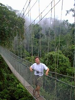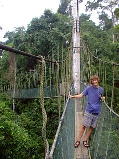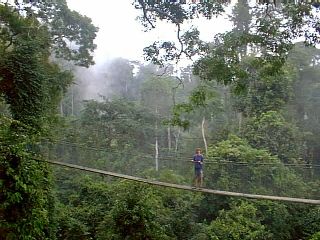 Camped at Amonabu Beach Resort and splashed out on a dinner in the restaurant. This is a lovely place and we would have liked to have stayed for a little longer but time was pressing on. In the morning Andrew and I went to Kakum National Park while Sally and Noel returned to Accra to sort out some work on Turtle. Kakum has seven high canopy walks above the rainforest which you can cross when on their one hour tours (longer if you wish to pay extra). The walks are at 40m above the forest floor. It was so beautiful and peaceful. We didn't see any animals but we could hear them. It is possible to go on walking tours and/or the canopy walk. All activities must be with a guide and you pay for the privilege. Tourists are charged 22,000 cedis, locals pay 4,000 cedis. These days I seem to have many arguments with locals about their prices. I still cannot figure out how 22,000 cedis + 500 cedis equals 22,000 cedis! The man behind the desk could make sense of it and tried to explain it to me. Talk about getting nowhere. It just doesn't work and he thought it did. After ten minutes it was just too much arguing over 12p. Andrew and I came to the conclusion that if you try and understand these people you would die of frustration before you got there.