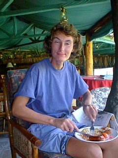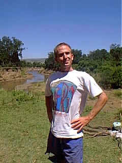 On Wednesday 29th we were up early to go leopard spotting but after hours of driving around found nothing. We did get to see a lot of Eland though which was quite a Brucie bonus. After a hard mornings safari we decided to go to the Mara River Lodge for breakfast. Oh what a treat. On wicker chairs overlooking the river we tucked into fruit, fruit juice, cereal, bacon & eggs etc. The lodge even had a flush toilet. We played games, read the newspaper and generally lived it up for a few hours before setting off again on another leopard hunt. James was with us again and we doubted his ability as a guide. However, he did do a good job at extracting money out of us for camping fees. That night we camped next to the river in an area near to where the leopards supposedly hang out. As night fell, zebra and giraffe passed us as they walked to the river to drink.