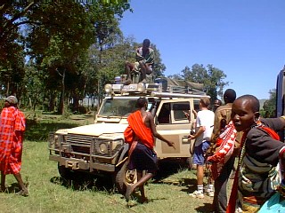 The next part of the journey towards the entrance of the Masai Mara Reserve was very interesting. The road got worse as we approached the escarpment and we were given the choice of many tracks down the mountain. We obviously chose the wrong one and found ourselves in first gear in low box traversing down the mountainside trying to avoid thorny bushes, gullies, trees and rocks galore. At the bottom we were met by locals telling us we'd gone the wrong way. Really! They said that one of their tribe would guide us for the rest of our journey as a woman carrying a big suit case ran over and ensconced herself in Comet, obviously wanting a lift.