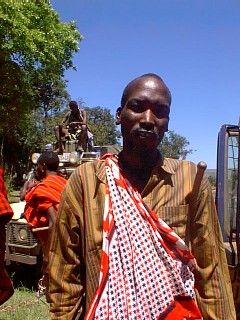 In the morning we awoke to the sight of the elephants doing a walk past. Beautiful. The baboons were active, the hippos back in the water and the crocs basking, open mouthed in the sun. After a cooked breakfast at our superb location we were soon inundated by local masai and their wares for sale. More and more came along and it turned out to be quite an event. They wanted money for taking photos and eventually Gordon agreed to one photo of a gang posing on Comet. In fact he took two. Andrew used the digital camera to show them a photo of themselves - but of course this wasn't a proper photo so shouldn't be considered as worthy of some cash. Gordon showed them what it was like to look through a video camera. They didn't realise it was recording all the time and he has some good footage of the locals in their proper attire. Some of the masai speak only Swahili, others speak the most brilliant English. They constantly amazed us. They load their ear lobes with earrings until the hole is huge and the loop able to pass over the whole of the ear. The red worn by the masai is visible from a long way off. It scares off the lions! The masai no longer carry spears in the Reserve but do have machetes. A masai warrior has to kill a lion before being a fully fledged member of the tribe.