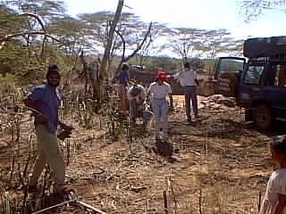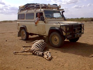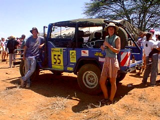 By Wednesday 31st we had given up hope completely on the Sudanese visas. At the customs department we got our carnets stamped for the 10th as we had decided to exit Kenya through an unofficial border by Lake Turkana to avoid the terrible road conditions, the military convoy and the bandits on the usual Moyale route to Ethiopia. After spending three hours getting a new windscreen and a similar time stocking up on food at the supermarket we were back on the road. We had been invited by Tipsys family to one of Kenyas annual events - the "Rhino Charge". First we had to make our way towards the designated competition site and spend the night in the carpark of the Sikh temple! Tipsys family had entered two teams. The aim of the event is to raise money to build a fence to protect rhinos in Kenya. The 7000Ksh (£700) entrance fee is prohibitively expensive for most but around fifty teams entered and the task was to drive through the bush between twelve control posts in the shortest time and the shortest distance. Ten and a half hours were given to complete the task and the shortest circuit possible was approximately 45km. However the area consisting of Masai bushland with its riverbeds, boulders, inclines, thorny bushes and very few tracks made this very challenging terrain indeed. GPS co-ordinates of the control points were given and it is up to teams to determine where they go.