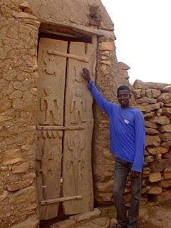 The back streets of Sogolo from Sekou's grannies house | Roof with a view | Local medical centre 'Gnuna' - The cavities hold traditional implements | Sekou with some well fitting carved doors | Grain stores, sitting on stones because of rain. |