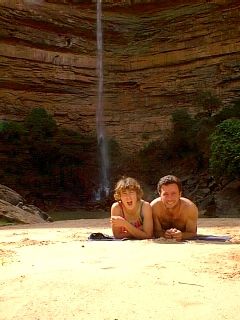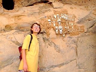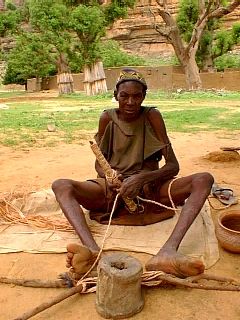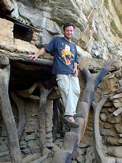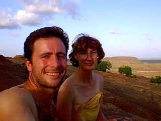 2 km further on you reach the escarpment and drop down to the base via a twisting road through spectacular scenery. The views over the plain were incredible and there are abundant fantastic campspots (nowhere to camp said our guide). At the base we arrived at our third village of Kani where Sekou took to his chair whilst awaiting lunch. After an argument with him (we're here to see, not to sit down) he took us around the town to see the casa parlabaler, the gnuna and the religious villages. Am I starting to sound cynical? We also saw an old man making rope out of boabab trees and a couple of kola-nuts enabled us to take a photo of him. When the chicken arrived in the pot it didn't resemble the black feathered bird we had seen earlier curiously looking around! After lunch we visited our last village of Teli where we briefly met with the chief before taking a short hike up the cliff to see the abandoned pygmy villages. Here was where Sekou decided the tour ended. It was two oclock and we were only just starting to enjoy ourselves. It was also time for revenge. Given that we were taking Sekou back up the Falaise he had to wait until we were ready! We took our time at the pygmy village because it was so fascinating. Afterwards we went swimming under the Teli waterfall for an hour or so. Met up with a couple from Belgium and it seemed that they had been having similar post-party problems. In fact their original guide was in no fit state to take them and the replacement turned up an hour and a half late. At about 5.30pm we dropped Sekou off at Dji then found our heavenly campspot and watched the sun set over the Falaise