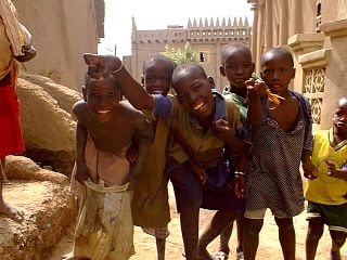 Punda has to do some wading to get on the Djenne ferry | The back streets of Djenne | Large mud mosque in Djenne | Djenne street kids | The back of Chez Baba - had a nice meal here |