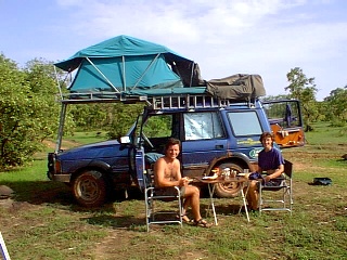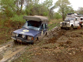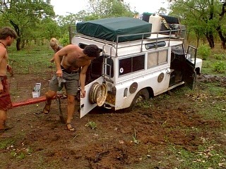 The next day we awoke to clouds and we had only been on the track for a little while when the storm hit. The tracks became rivers within minutes and we were forced to sit it out for an hour or so. As the day progressed so did the events. Camel Trophy has nothing on us! Crossing palm bridges was interesting but by mid afternoon we were up to the chassis in mud - really think jelly welly type stuff. It wasn't long before our shoes were off and we were sliding around with shovels, sand tracks and .....the moment we were waiting for .......the winch. Hurray!!!! Both Punda and Turtle were winched out of some sticky situations and we were filthy. The park is approximately the same size as The Gambia and given that the route ahead was long and of uncertain condition we decided to turn back. If we had continued and had some problems then it is likely that we would still be there. Support teams don't exist out here, even when the park is open. We reached Badi camping point just before nightfall after a few more adventures in the mud and disturbed a hundred baboons who were sleeping in the trees above. What an incredible sight. The speed that the baboons descended the trees and exited was amazing - it was like a wave of baboons. It wasn't long before they were back and kept us awake with their mating calls or the like.
