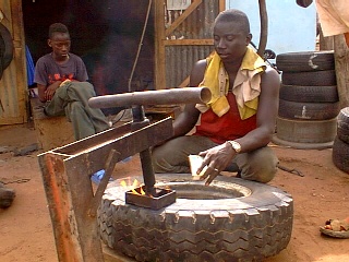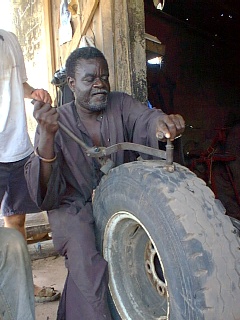 We returned to Tamba (passing Chris going towards the park) to visit the bank, market, chawarma bar and to get Noels puncture fixed. Africans will fix practically any tyre - vulcanising the side wall made very interesting viewing. Tyres that we would throw away in England are almost new over here. In the town a couple of donkeys were up to rumpy pumpy in the street. The local children were laughing but the sight brought tears to my eyes and Andrew was very jealous indeed!!!!!